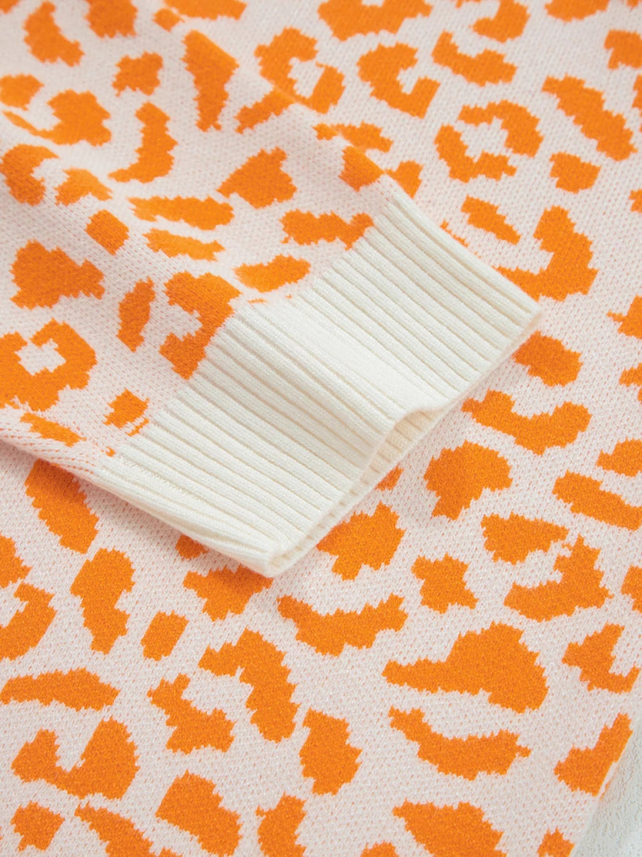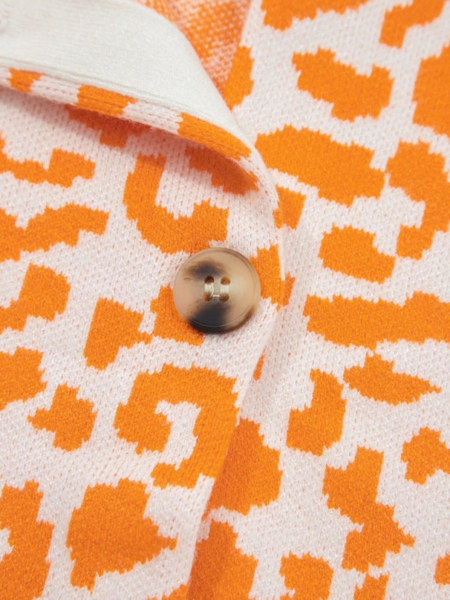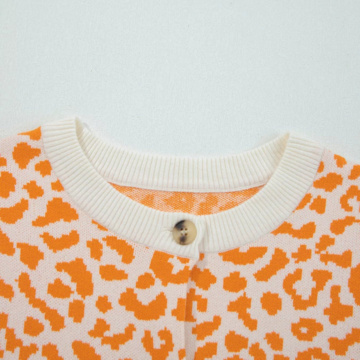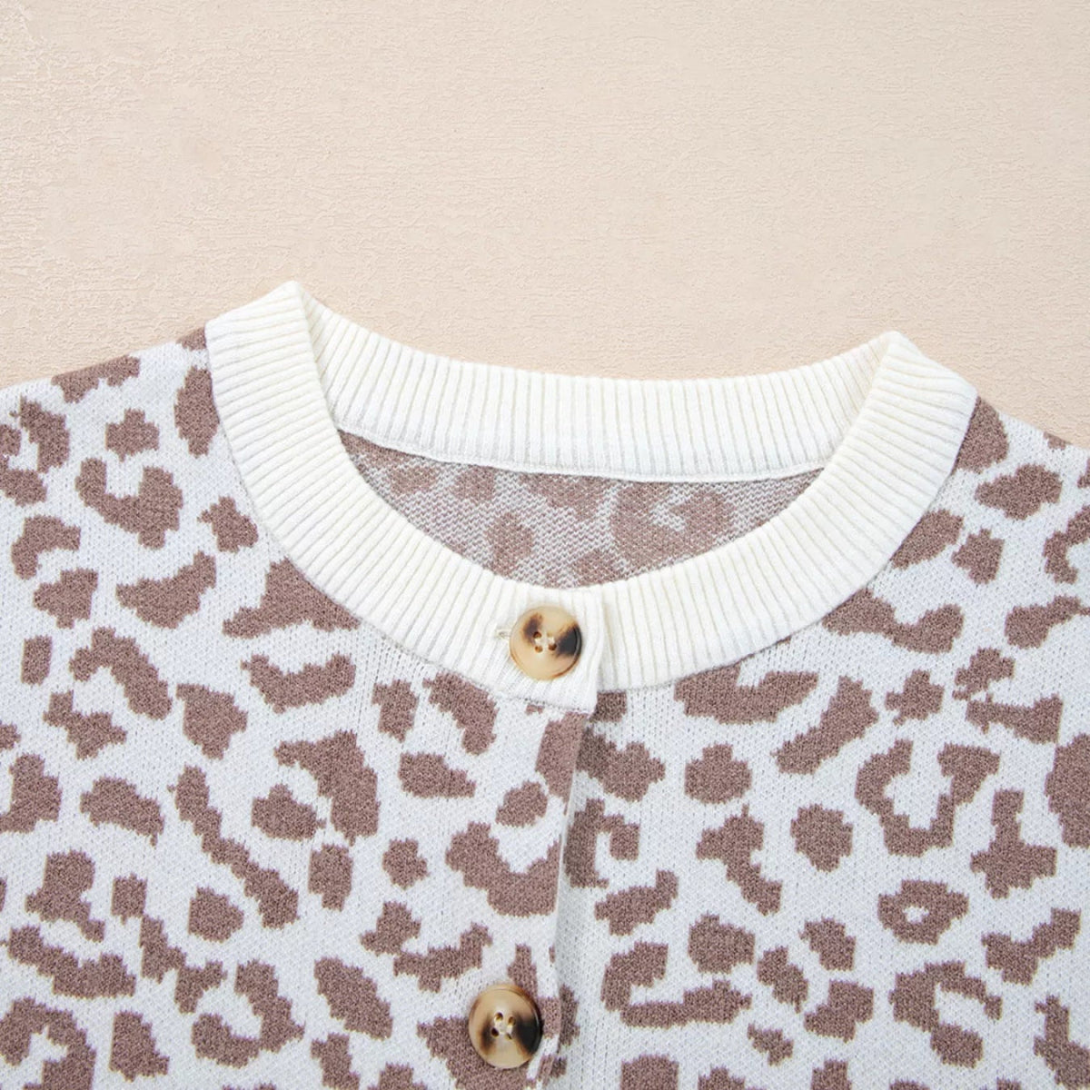 This Leopard Drop Shoulder Chunky Knitted Cardigan offers a relaxed fit with a stylish drop shoulder design.